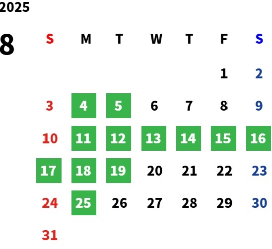 8月1日~31日までの夏休み期間