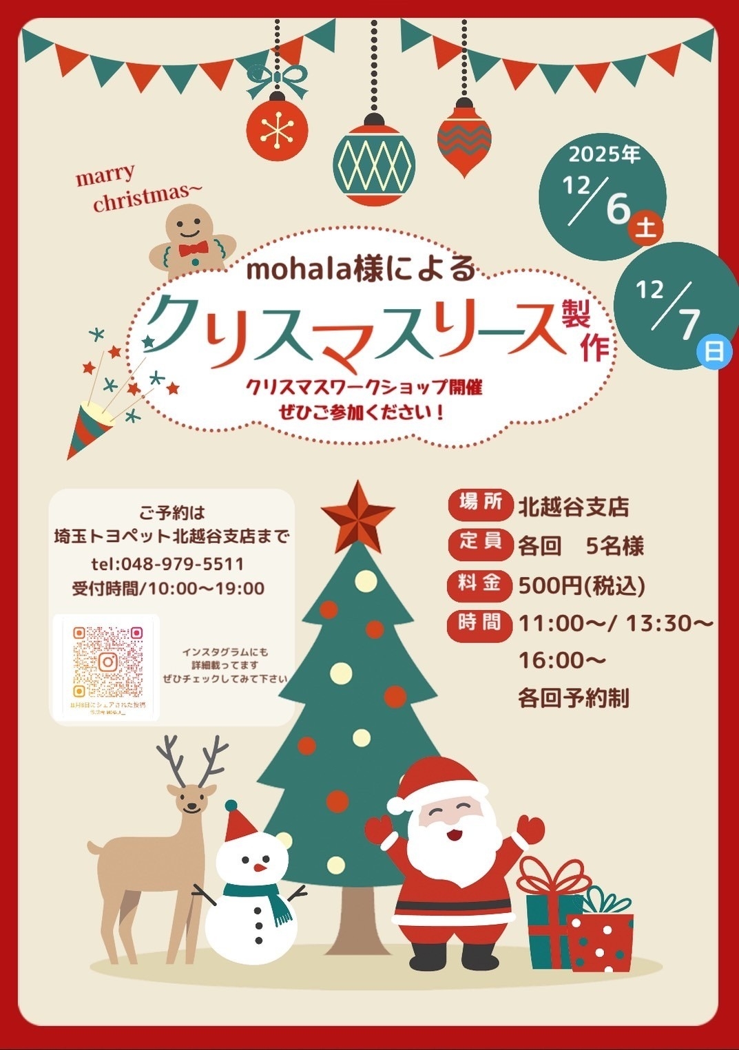 今年は12月6日(土)と7日(日)にみんなで楽しめるクリスマスリース教室を開催します!!