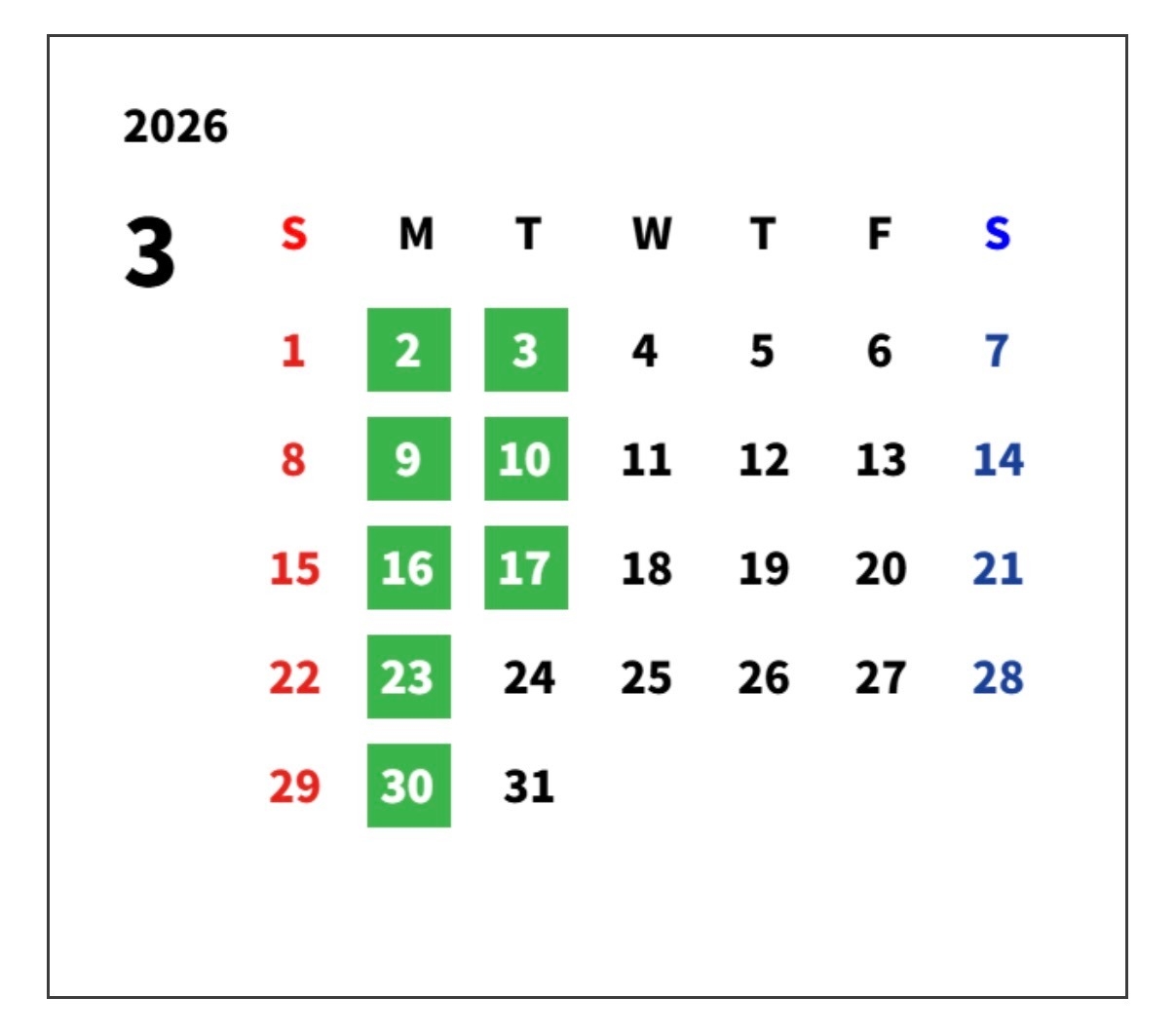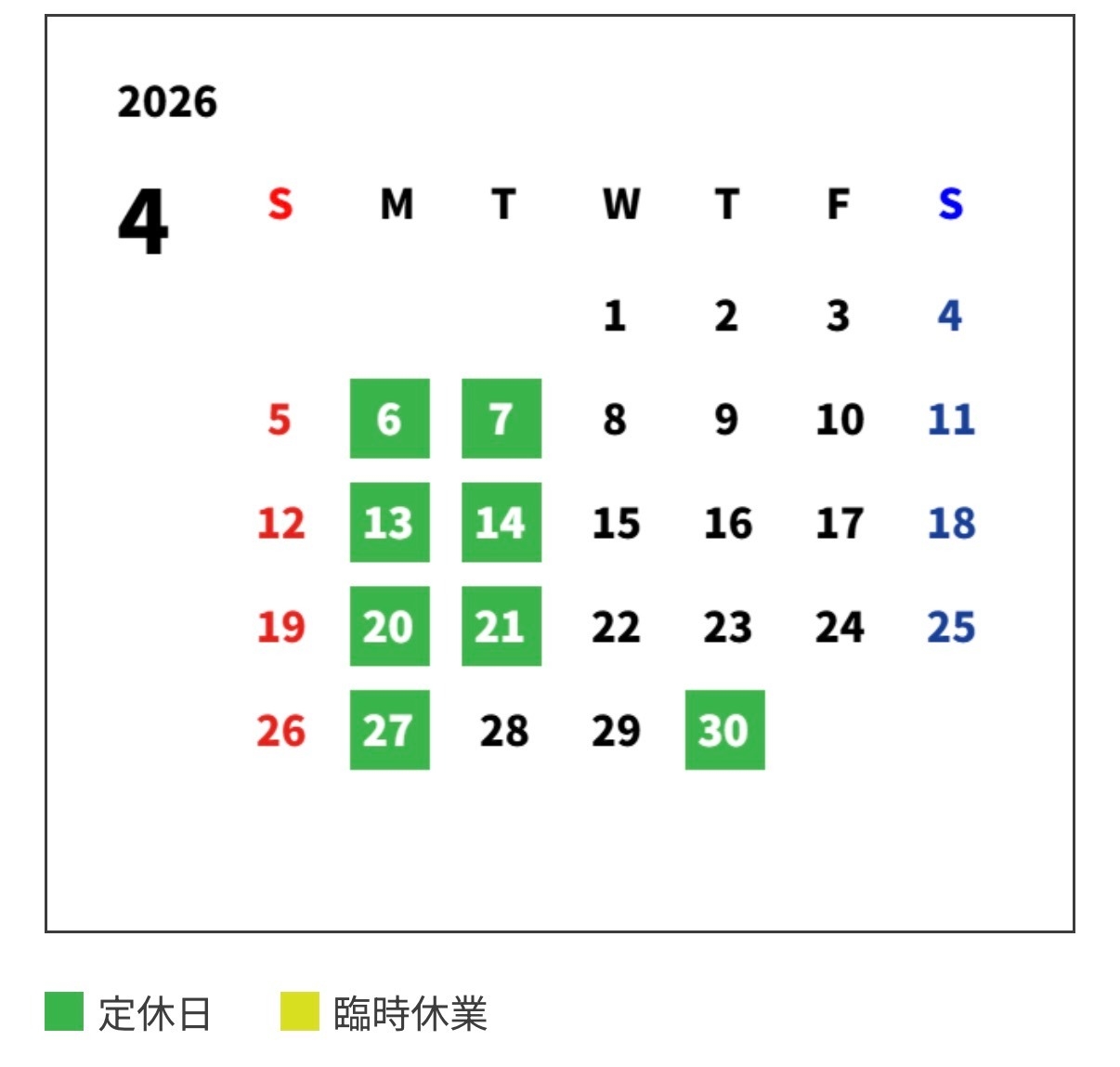 最後に3月、4月の定休日のお知らせです